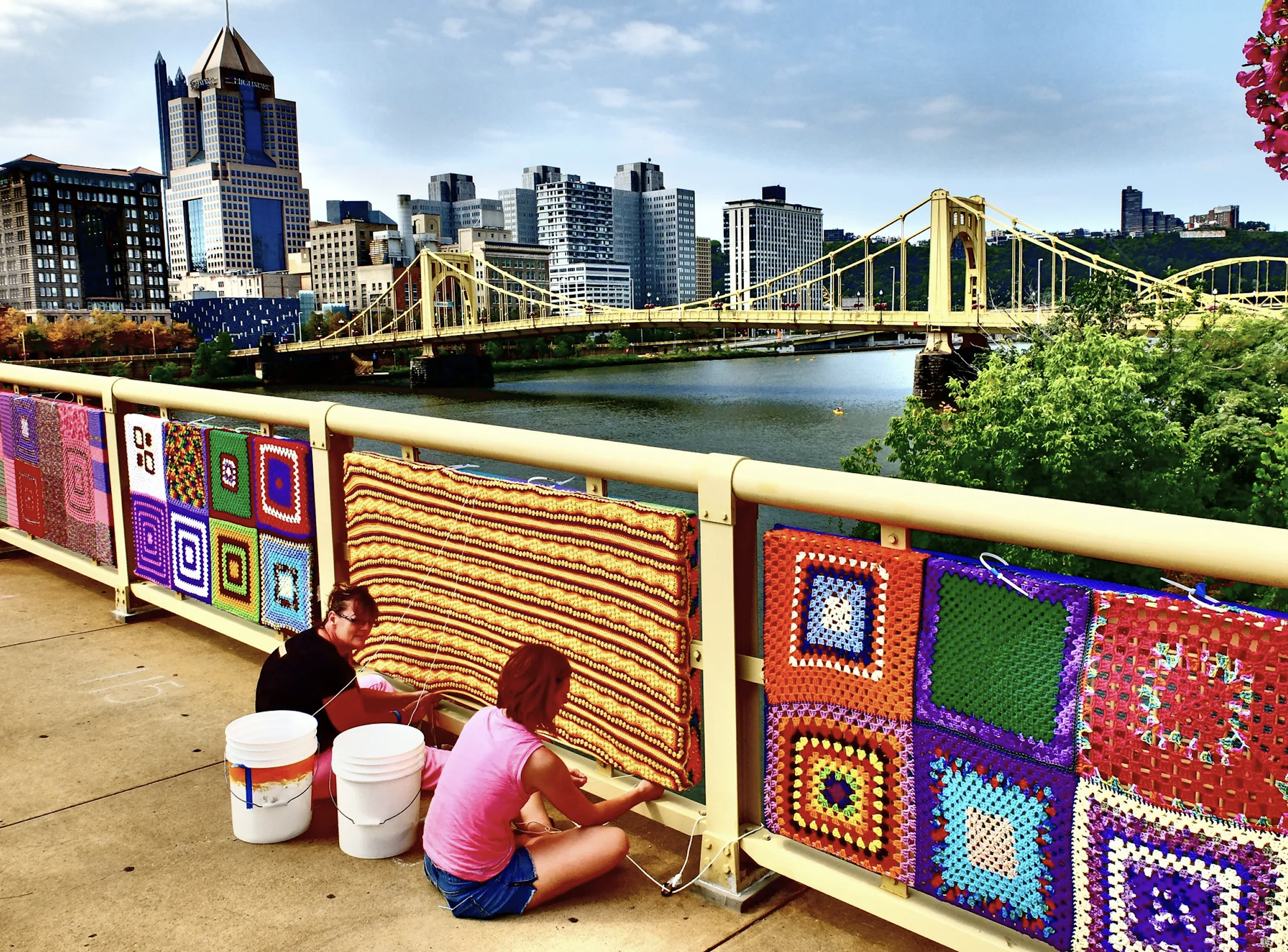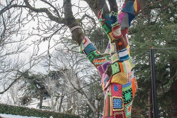 Yarnbombing is a colorful and playful form of street art that covers public objects – trees, benches, railings, etc with knitted or crocheted yarn pieces. Our goal is to create community yarnbombing, so each covered object is made up of multiple smaller crocheted or knitted squares, rectangles , circles, etc., attached to create a fun, colorful, and funky art display.